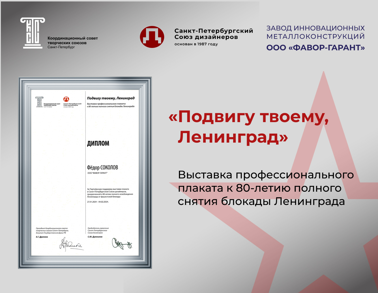 Полная информация об открытии выставки «Подвигу твоему, Ленинград» на официальном сайте Санкт-Петербургского Союза дизайнеров.